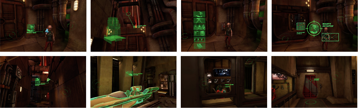 I created a unique HUD UI system to give a distinctively assassin droid play experience. The monochrome green and geometric elements reference vintage arcade graphics and real-life military HUD displays.